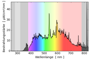 - Quecksilber (immer vorhanden): 254nm, 297nm, 316nm, 334nm, 365/366nm, 404/407nm, 436nm, 546nm, 577/579nm, 1014 nm, 1129nm, 1357/1367/1395nm, 1530nm, 1692/1707nm