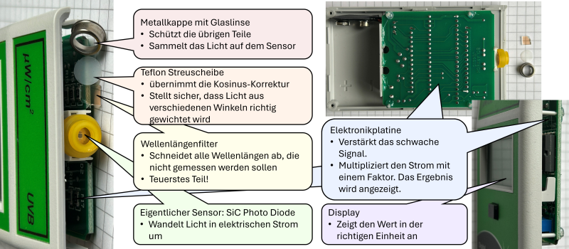 Mir ist leider kein bezahlbares Messgerät bekannt, das einen externen Sensor hat. Laut Auskunft von Frances Baines2), die in engem Austausch mit dem Erfinder der Solarmeter stand und die Messgeräte zusammen mit dem Elektroingenieur Andy Beveridge untersucht hat, ist das elektrische Signal des Sensors so extrem gering, dass es schwierig ist, nach einem längeren Kabel noch ein verlässliches Signal zu erhalten. Wie auf den obigen Bilder zu sehen, ist die SiC-Diode direkt mit der Platine verbunden.