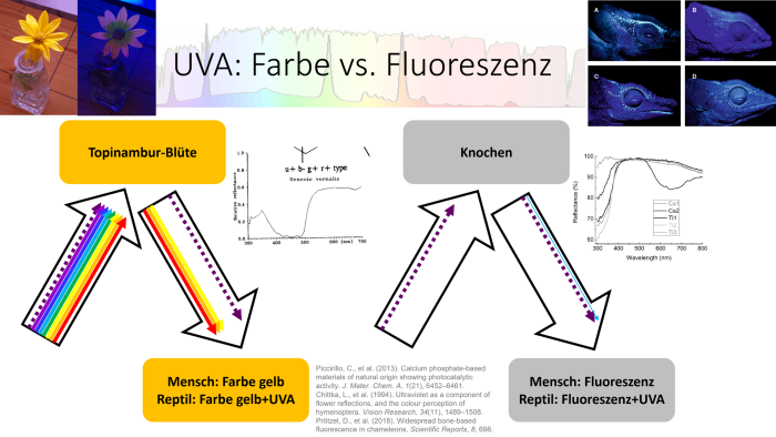 Ich bin sehr skektisch, ob der Effekt der Fluoreszenz durch Knochen bei Reptilen für die Tiere praktische Relevanz hat. Damit Reptilien und Amphibien diese Fluoreszenz sehen können, muss das emittierte Fluoreszenzlicht heller sein als das normal reflektierte Licht. Bei einer Beleuchtung mit reiner UVA-Strahlung ist das der Fall: Das emittierte grüne Fluoreszenzlicht ist automatisch heller als das reflektierte grüne Licht, weil es ohne einfallendes grünes Licht kein reflektiertes grünes Licht gibt. In der Natur ist in den allermeisten Situationen das Licht im blau-grünen Spektralbereich sehr viel heller als die UVA-Strahlung. Das Fluoreszenzlicht ist zusätzlich immer schwächer als die anregende UVA-Strahlung. Vor dem Hintergrund des hellen sichtbaren Lichts kann das sehr schwache sichtbare Fluoreszenzlicht nicht wahrgenommen werden.